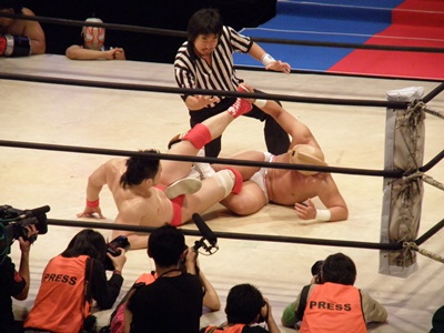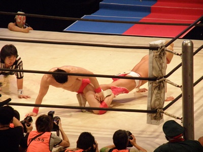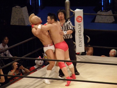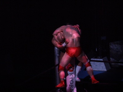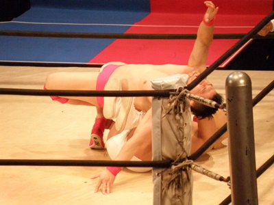 ロックアップ、美濃輪ロープに押し込む(右写真)、ブレーク。再度ロックアップ、また美濃輪が押し込む、キン肉マン体勢入れ替える、ブレーク。
