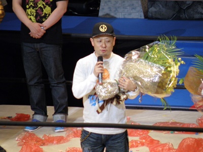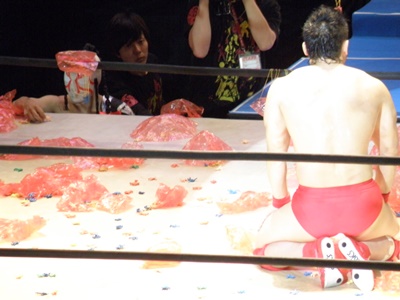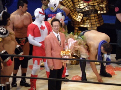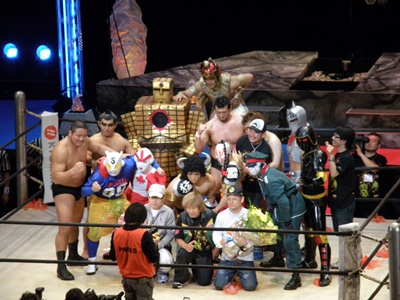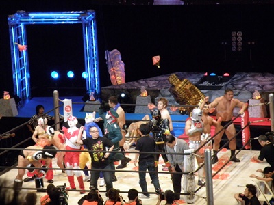 全選手がリングに上がりキン消しを会場に投げ込む(右写真)。