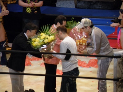 週刊プレイボーイ編集長の樋口尚也氏と2人でゆでたまご先生に花束(右写真)。