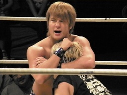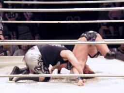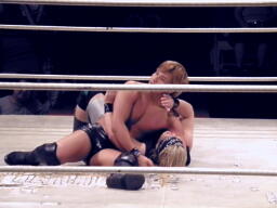 両者立ち上がる、ウラノ首固め(左写真)、カウント3。