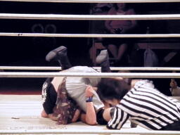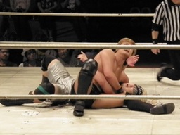 ウラノ逆さ押さえ込み(右写真)、円華立ち上がってキック、カウント2。円華クリップラー・クロスフェース、ウラノロープ。