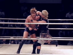 ロックアップ、円華ロープに押し込む(左写真)、ブレーク。再度ロックアップ、今度はウラノがロープに押し込むが円華体勢入れ替えて離れ際にチョップ。