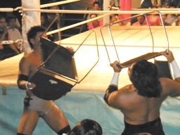 澤がいきなりシャイニングウィザード。しかしこれはゴング前。GENTARO場外でインターバル取る。GENTAROリングに戻る、澤ストンピング連打。GENTAROロープにすがって立ち上がる、澤突っ込む、GENTAROロープを引き下げて澤を落とす。場外でイスチャンバラ、と言っても折り畳みイスではないのでいまいち使いづらそう(右写真)。