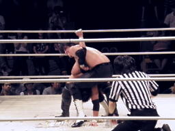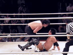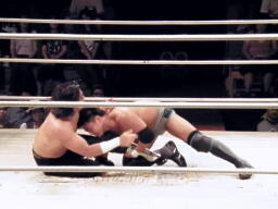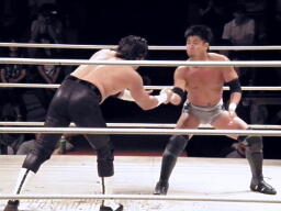 リングに戻ると張り手の打ち合いから澤がパンチ(左写真)。残り試合時間1分。