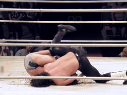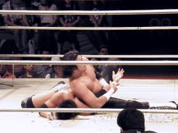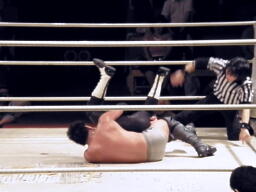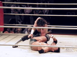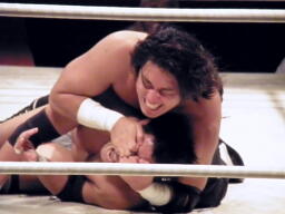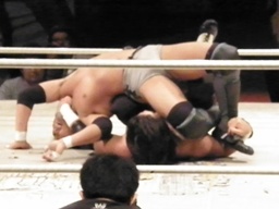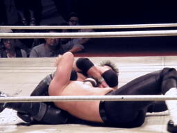 GENTAROネックロック、澤切り返す、GENTAROエビ固めに、ヘッドロック、澤がエビ固めに、GENTAROはワキ固め(左写真)。5分経過。