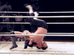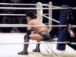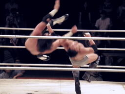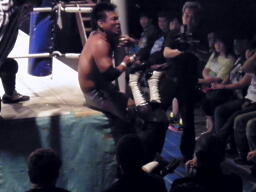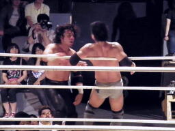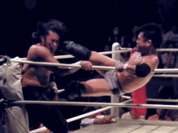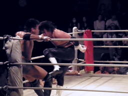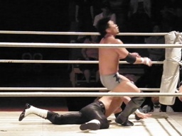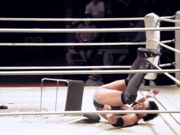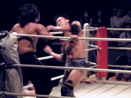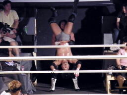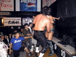 GENTAROの首をエプロンから出してエルボースタッブ(右写真)。、GENTAROは場外転落。澤は客席に投げ込む。