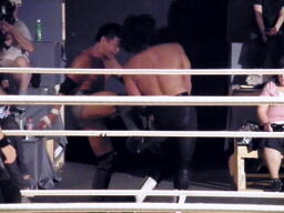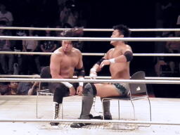 両者イスをリング中央に寄せて、座った状態で張り手の打ち合い(右写真)
