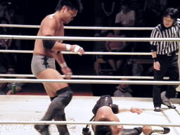 GENTAROのビッグブーツで澤ひっくり返る(左写真)、しかしすぐに立ち上がってGENTAROにシャイニングウィザード、カウント2。澤十字、GENTAROロープ。