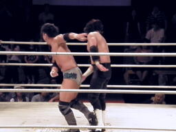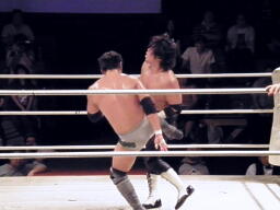 GENTARO逆水平、張り手(左写真)。澤も張り手。澤コーナーに振って串刺しエルボー、串刺しドロップキック。