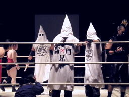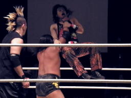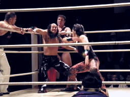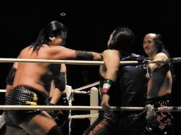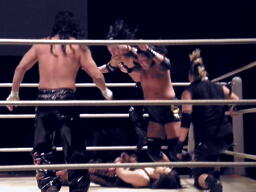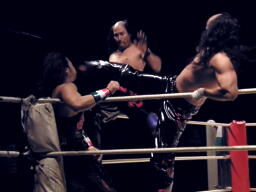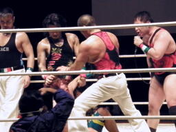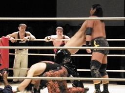 アントンロープワークからテーズプレス、そしてエルボードロップ。DDTに行くがケイはロープをつかんでブロック。ケイはシュウを呼び込んでアントンにサンドイッチハイキック(左写真)。Kenが入ってバックドロップ、カウント2。大鷲コーナーに上るがトーゴーが阻止。PIZAは大鷲をガムテープでぐるぐる巻きに。