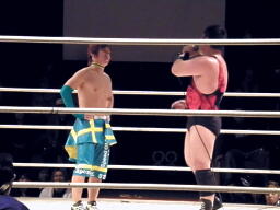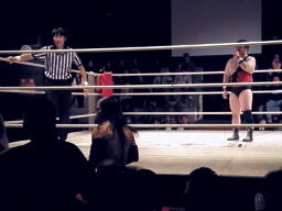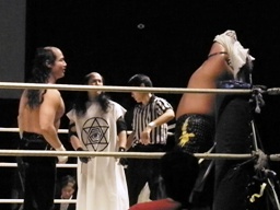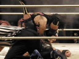 コーナーに連れ帰りイタリア国旗でホールドしてガッバーナがバックハンドチョップ(左写真)。トーゴーがシルバーブレット、バックハンドチョップ。PIZA入ってトラースキック。10分経過。