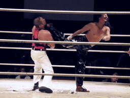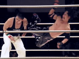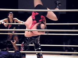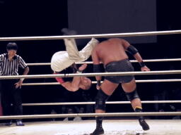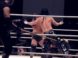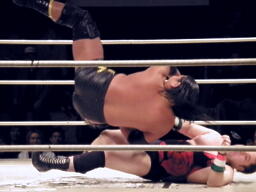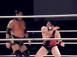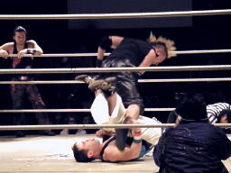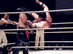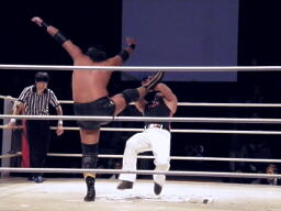 大鷲ノド輪落とし、トーゴーホイップで切り返しオーバーヘッドキック(左写真)。トラースキックはかわされるがトーゴーサッカーボールキック、回転ネックブリーカー、カウント2。ガッバーナにタッチ。大鷲もKenにタッチ。