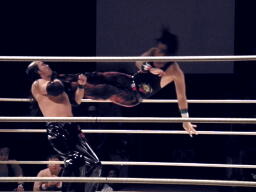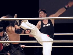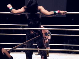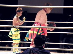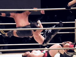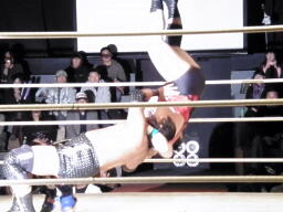 シュウミドルキック(左写真)、トーゴーはパンチ。トーゴーコーナーに振る、シュウ切り返す、トーゴーコーナーに飛び乗る、ちょっと失敗気味だったがすぐに体勢立て直してトペ・コン・ヒーロ。ケイとガッバーナにタッチ。