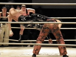 トーゴー入って首投げからニースタンプ、カウント2。アントンにタッチ。シュウがアントンをブレーンバスターで投げる(右写真)、しかしタッチは阻止される。