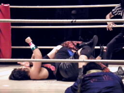 エルボーとチョップの打ち合い、PIZAスキを突いて急所蹴り。KenはPIZAをエビに固めて急所にパンチ(右写真)。シュウとトーゴーが入る。