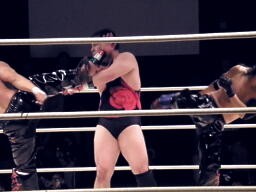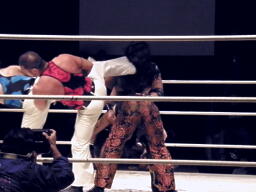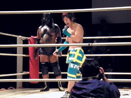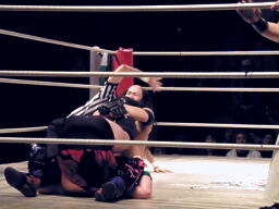 トーゴーイタリアンレッグスウィープ、PIZAが入ってキック、シュウはエルボー、PIZAサミング。コーナーに戻すとアントンがイタリア国旗で首を絞める(左写真)。