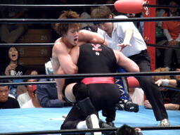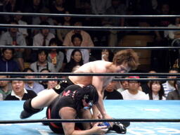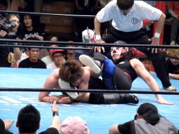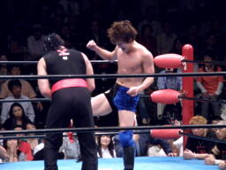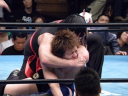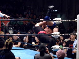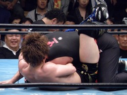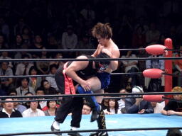 サスケガットショットからヘッドロック、ロープワークからサスケアームドラッグ(左写真)。ハヤトがキック、サスケキャッチしてヘッドバット、キャプチュードで投げる。ハヤトは場外エスケープ。サスケ追いかけて客席に振る。ハヤト切り返す。5分経過。