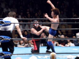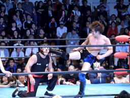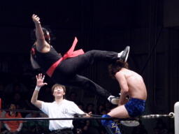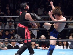 ハヤトはサスケをリングに戻し投げっ放しジャーマン(左写真)。ハイキック連打、カウント2。