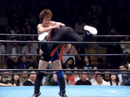ハヤトパンチの連打、サスケ腕をキャッチすると組み付く。まさかのかんぬきスープレックス(右写真)、カウント2。