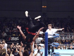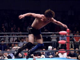 ハヤトキック連打、ハイキックをサスケかわすと鉄柱に誤爆、ハヤトダウン。サスケはハヤトの頭を鉄柱にぶつけるとコーナーからトペ・コン・ヒーロ(右写真)。