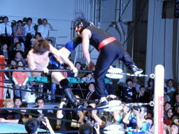 サスケコーナーに上る、ハヤト下からジャンピングハイキック(右写真)、サスケ場外転落。