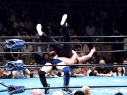 サスケ再度コーナーに上ると場外へのライダーキック(左写真)、リングに戻る。