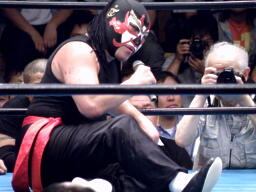 サスケはハヤトをブレーンバスターでエプロンに叩き付ける(左写真)