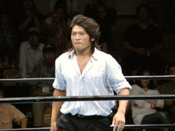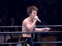 ハヤトはコーナーに上るとベルトを巻こうとするが今まで巻いたことないのでうまく行かず、結局肩に掛けて退場。