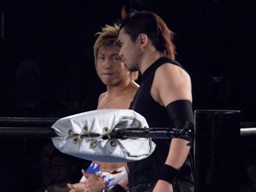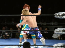 日高ロープに振ってエルボー、エルボードロップ2発。場外に出すと藤田が客席に投げ込む。リングに戻すと日高はパンチの連打(左写真)、オースギはエルボーで返す。日高逆水平、コーナーに追い込んで藤田にタッチ。