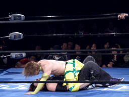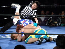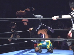 千賀がカニばさみで捕えた藤田にオースギがランニングニーアタック(右写真)、千賀がカニばさみのままエビ固めに、カウント2。