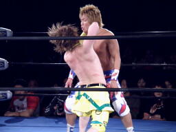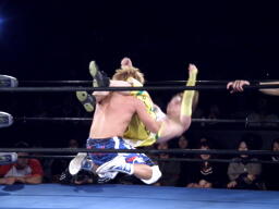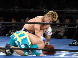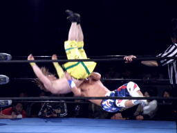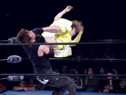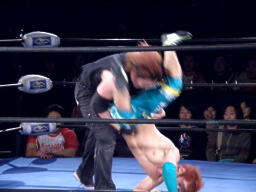 オースギと藤田エルボーの打ち合い、オースギロープに飛ぶ、藤田キャッチしてT-boneスープレックス(右写真)。