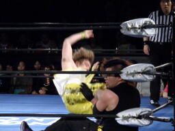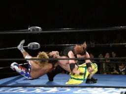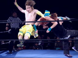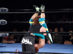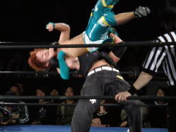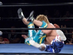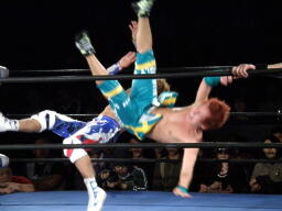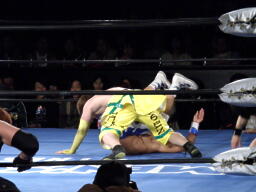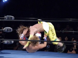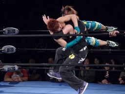 藤田コーナーに上る、オースギ追いかけて雪崩式ブレーンバスター狙う、藤田ブロック。藤田はコーナーから降りて雪崩式パワーボムの体勢、オースギウラカン・ラナで切り返す(右写真)。千賀にタッチ。15分経過。