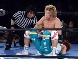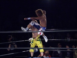 コーナーに追い込んで藤田に串刺しドロップキック(左写真)、カウント2。5分経過。