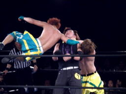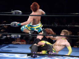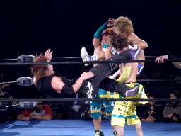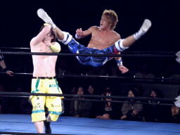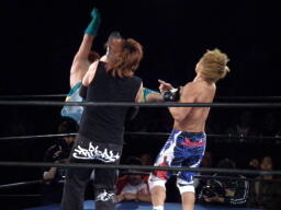 日高パンチ、ブレーンバスター、オースギ背後に着地、バック取る。日高エルボーでブレークしてロープに飛ぶ、オースギゼロ戦キック(左写真)。オースギタッチに行こうとするが藤田がその背中を踏んづけてコーナーに立つ千賀にドロップキック。千賀場外転落。藤田は「ナイスカット!」と自画自賛。