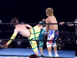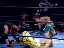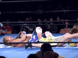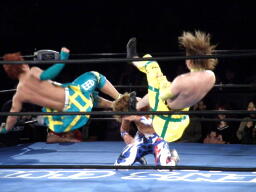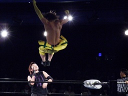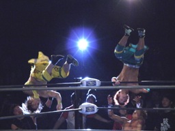 日高をリングに戻しダブルのフェースクラッシャー、ダブルのドロップキック(右写真)。