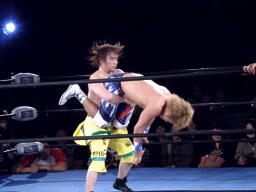 千賀がショルダーネックブリーカーの体勢に捕えたところにオースギがフライングネックブリーカードロップ(左写真)で飛んで行く。