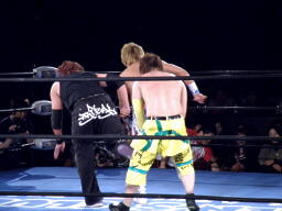 オースギを呼び込んでダブルでロープに振る、オースギが藤田を捕え千賀がロープに飛ぶ。千賀飛びついてフェースクラッシャーに行くが藤田が体勢を入れ替えたためオースギが被害に(右写真)。藤田はサミング、日高にタッチ。