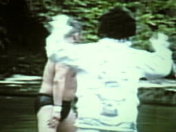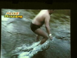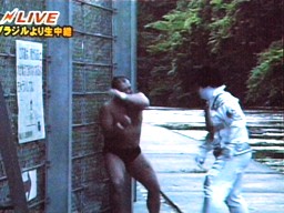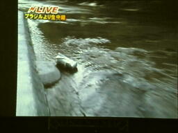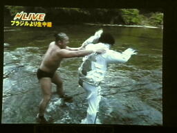 堤防からアマゾン川へのブレーンバスターを試みるメカマミー(左写真)。