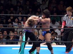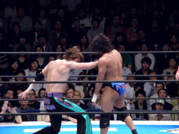 エルボー打ち合い(右写真)、YAMATOガットショット、ロープに振る、田口切り返してガットショット、相打ちに。YAMATOチンクラッシャー、ロープに飛んで顔面キック。