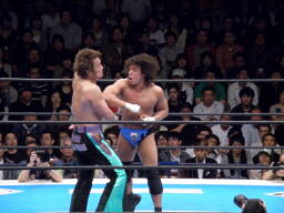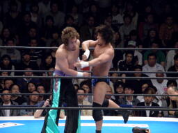 YAMATOロープに振る、田口切り返す、YAMATO回転エビ、田口立ち上がってドロップキック、YAMATOかわす(左写真)。YAMATOドロップキック、田口かわす。