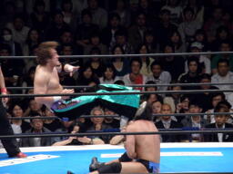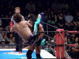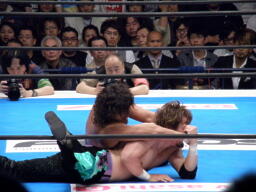 田口コーナーに振って突っ込む、YAMATOショルダースルーでエプロンに出す。田口エプロンからハイキック(右写真)。