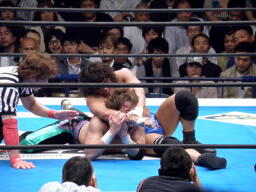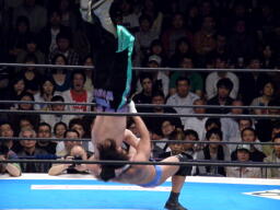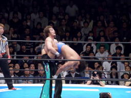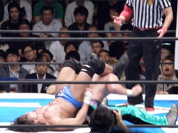 田口ブレーンバスター3連発(右写真)、カウント2。