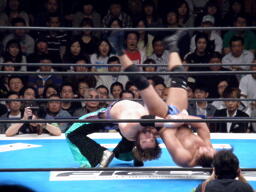 YAMATOジャーマン、2発目田口ブロックするが向き直ったところをYAMATOは垂直落下式ブレーンバスターに(右写真)、
