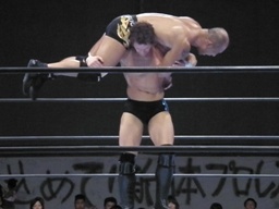 邪道はデヴィットをコーナートップに乗せて雪崩式ブレーンバスター(右写真)、カウント2。10分経過。
