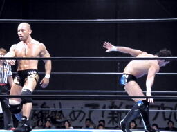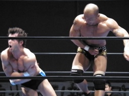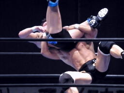 逆水平打ち合い(右写真)、邪道ロープに飛ぶ、デヴィットソバット。
