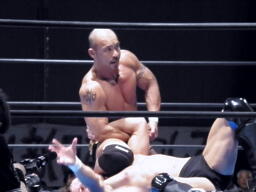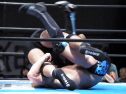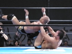 邪道首固め連発(左写真)、カウント2。