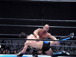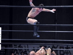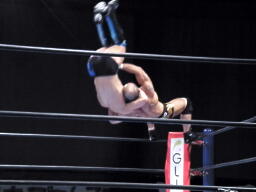 デヴィット攻められた左腕をかばいながら右腕でパンチ、邪道ロープに振る、デヴィット回転エビ、カウント2。邪道エルボー、腕にキック連打。邪道コーナーに振って突っ込む、デヴィットカウンターのキック、エプロンに出てスワンダイブ式ミサイルキック(右写真)。