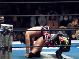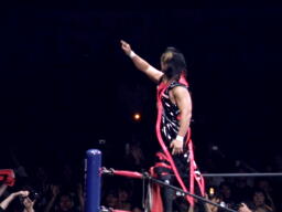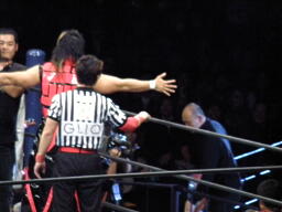 TAJIRIエルボーかわしてラ・マヒストラル(右写真)、カウント2。棚橋が立ち上がったところにニールキック。