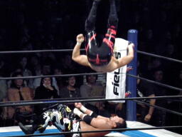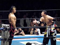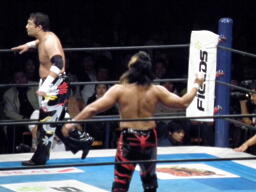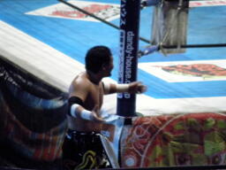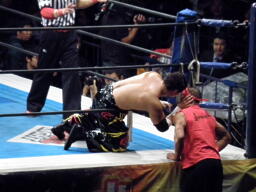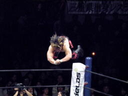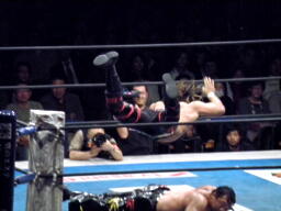 棚橋エルボー、ロープに振る、TAJIRIはハンドスプリングエルボーで返す(右写真)。TAJIRIロープに振る、棚橋フライングフォアアーム、TAJIRIは場外エスケープ。棚橋追うがTAJIRIはすぐにリングに戻る。
