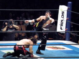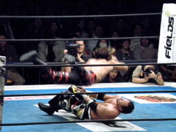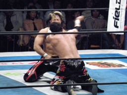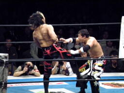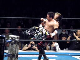 棚橋エルボー、TAJIRIかわしてフランケンシュタイナー(左写真)、カウント2。TAJIRIトラースキック、棚橋延髄蹴り、両者ノックダウン。